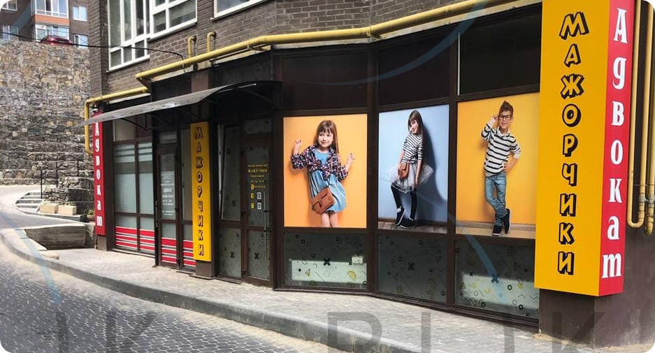 Також ефективним методом залучення уваги клієнтів є обклеювання вітрин. Ми робимо брендування вітрини з урахуванням вашого фірмового стилю. Скло вітрин обклеюються глянцевою, матовою, прозорою Плівкою з вінілу, або ж One Way vision (Перфорована плівка), а вже на неї наносимо зображення за допомогою широкоформатного друку. Для обклеювання можна використовувати майже будь-які надписи і малюнки. Плівка піддається плоттерній порізці. Цифри і букви обрізаємо по контуру за допомогою плоттера.